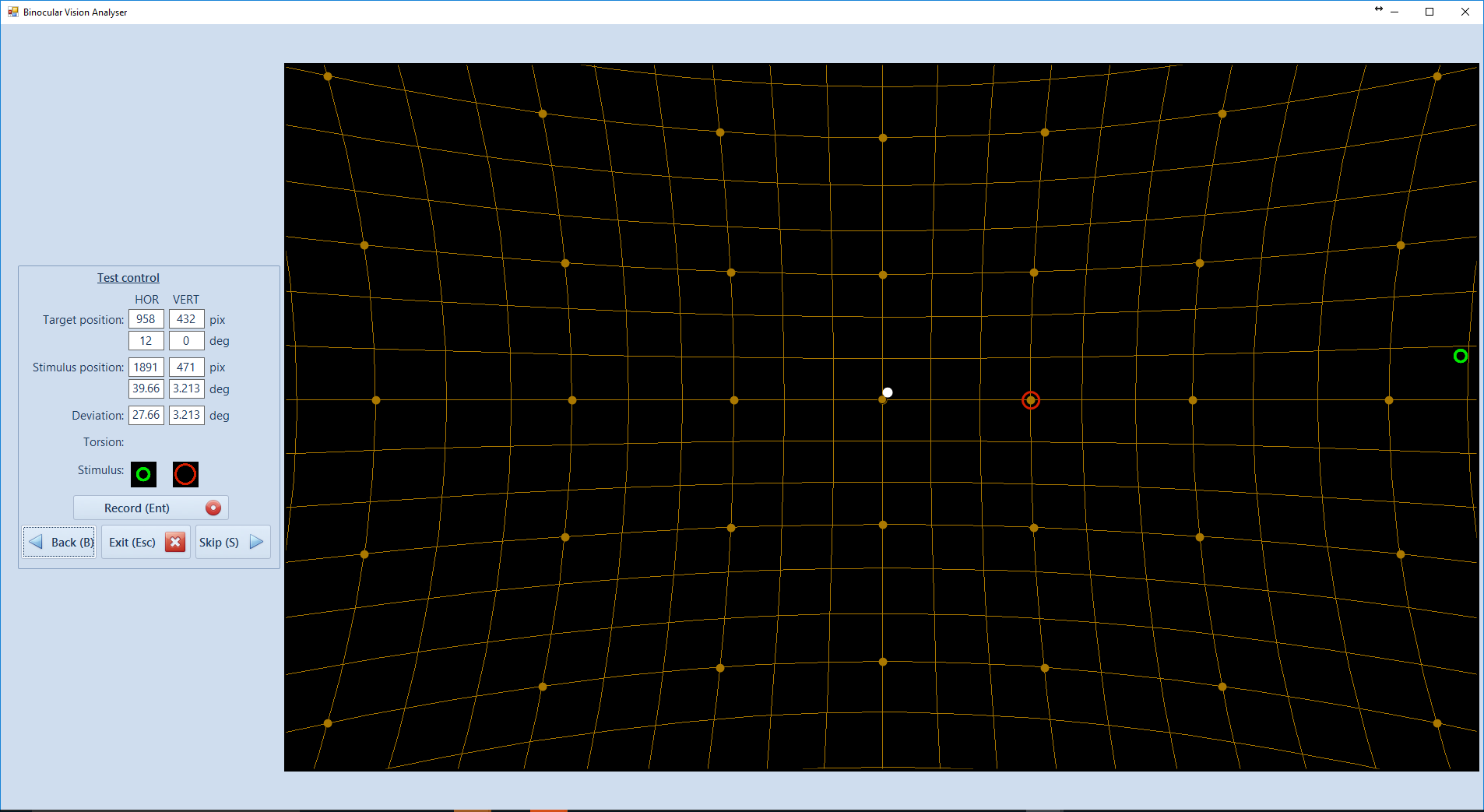 - When the patient clicks the left mouse button, a new target will be presented and the process is repeated. There are either nine or twenty five target positions for each eye depending on whether the Quick Test or Full Test option has been selected. After this the colour of the target and the stimulus is reversed and the field of the other eye is tested. This avoids having to reverse the coloured glasses.