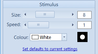 The default settings for stimulus size, colour and scrolling speed can be set to the current values by selecting Set defaults to current settings.