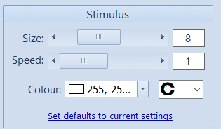 The default settings for stimulus size and scrolling speed can be set to the current values by selecting Set defaults to current settings.