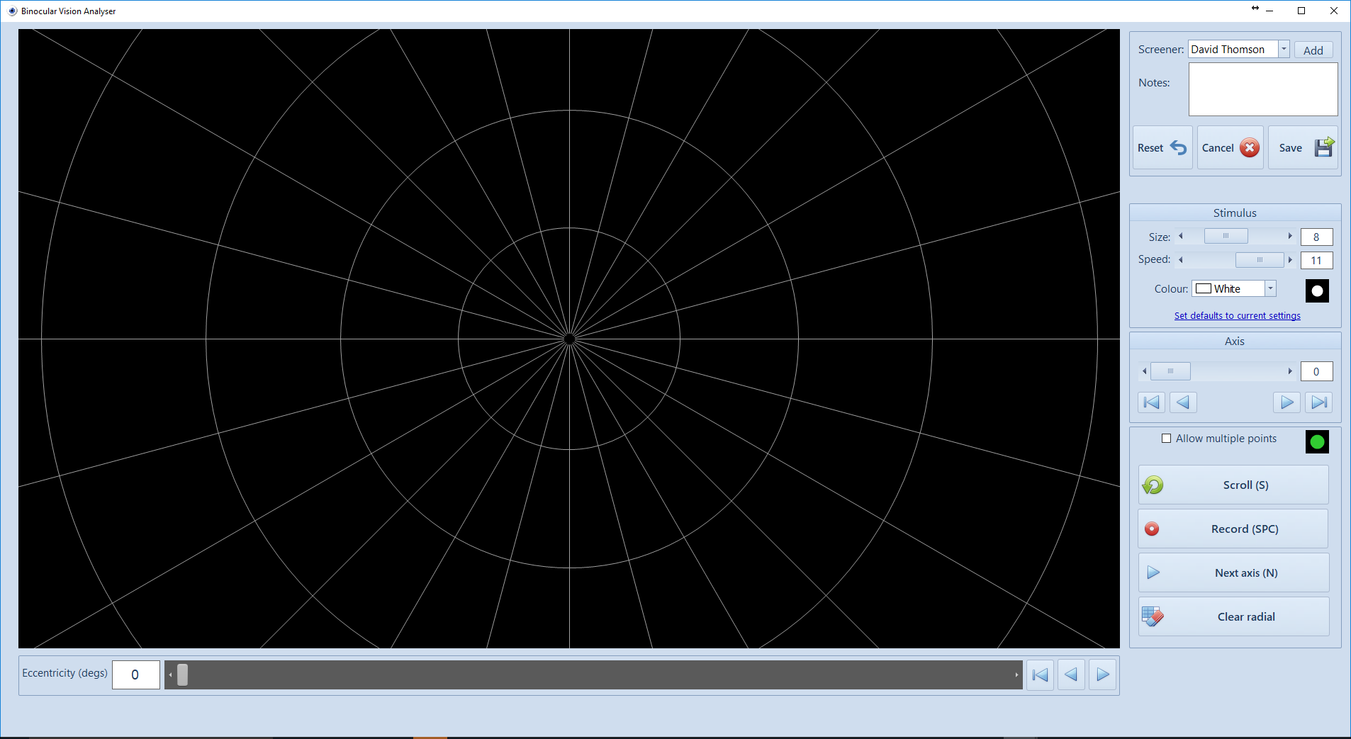 The Field of Binocular Single Vision test Starting a FBSV test To start a FBSV test, select the patient's name from the database list and select the FBSV test button in the toolbar. This will display the following on the Test screen and the Control screen: Control screen Patient's screen