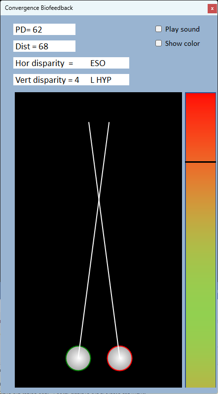 The Biofeedback utility shows the horizontal gaze location of each eye in real time and provides feedback on the current convergence being exercised by the patient.
