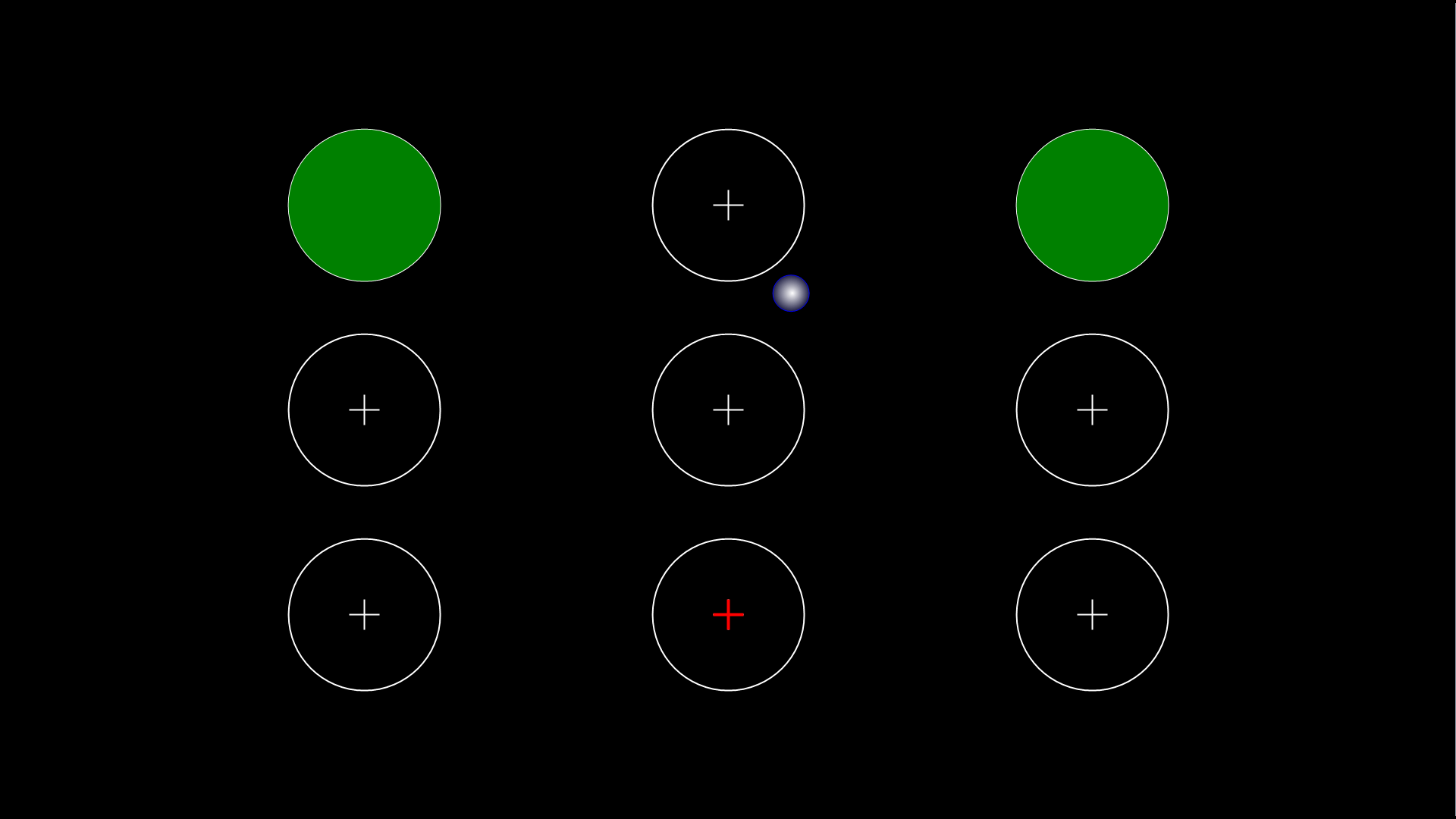 The task for the patient is to fixate within the circle showing the red cross. The circle is then shaded green and another circle becomes the target. The total time to complete the task is shown when all circles have been fixated upon.