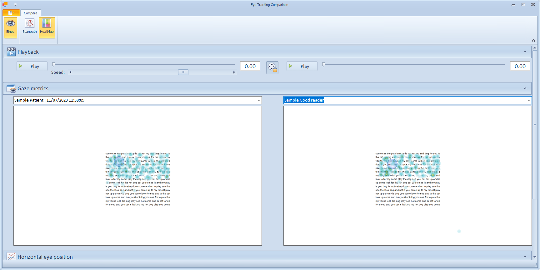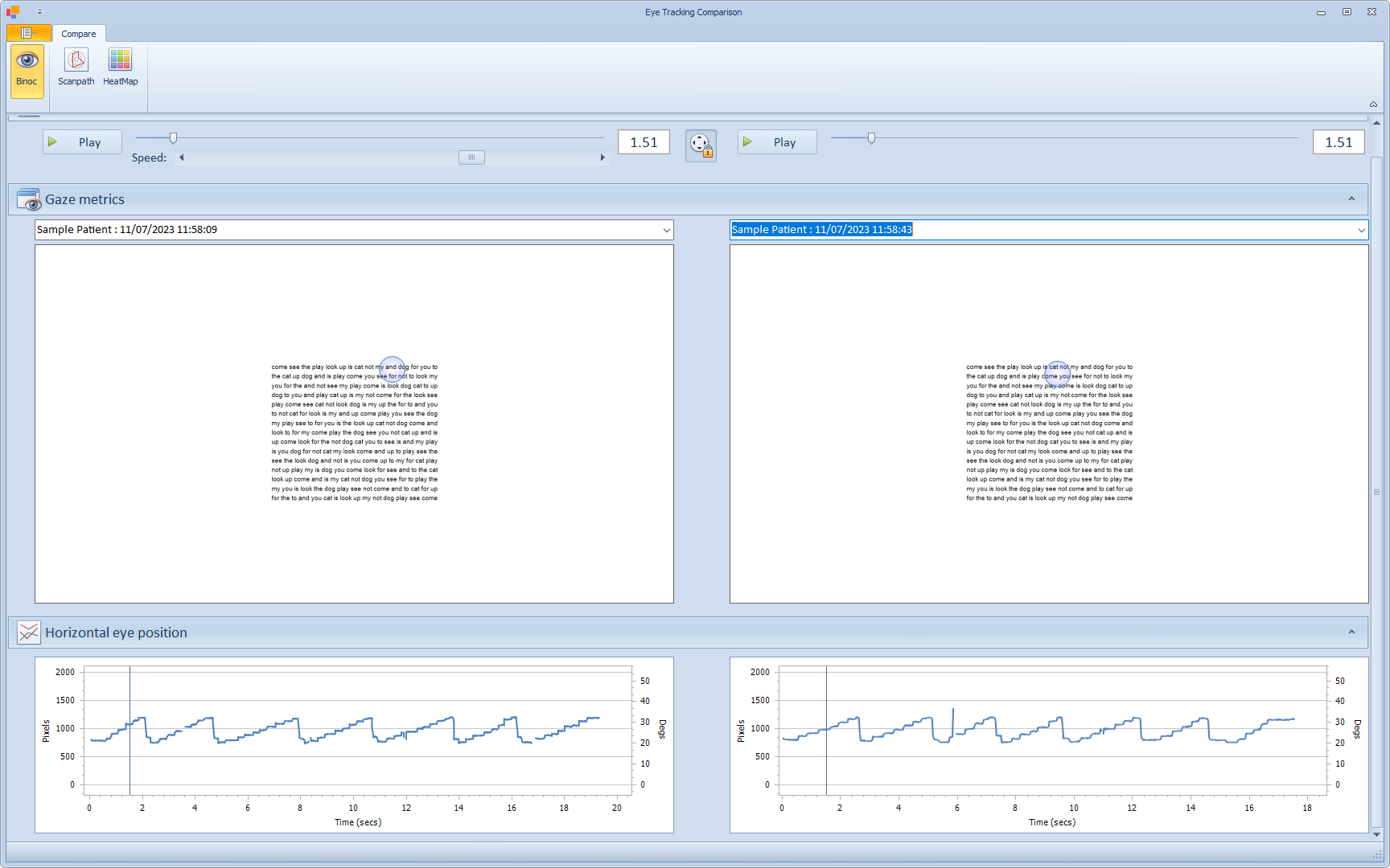 To replay the recordings, select Play or use the scroll bar next to the Play button. By default, the two recordings will be synchronised so that the two playback screens will be displaying the same time from the beginning of the recording. This allows the relative speed of reading (for example) to be compared. The speed of the playback can be varied using the Speed scroll bar.