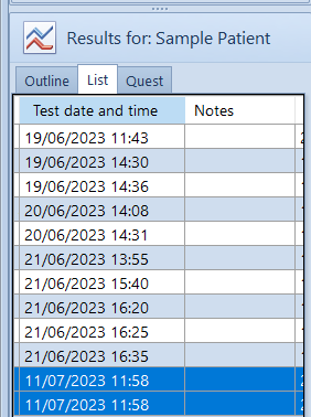 To compare two recordings for the SAME PATIENT, select the patient's name in the Current patient list and select the List tab in the Results list.
