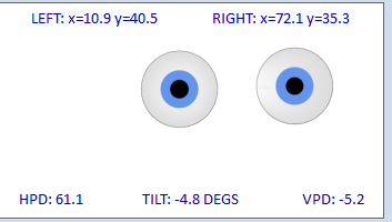 The Eye Position panel shows a representation of the eye position throughout the recording. The location of the centre of the pupils is shown in mm at the top of the graphic. This is measured relative to an axis from the centre of the screen and normal to the plane of the screen.