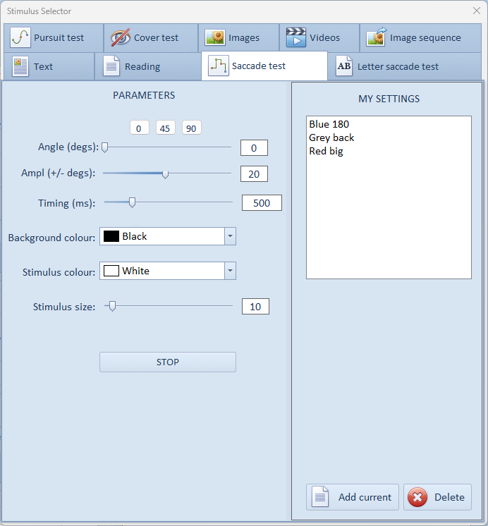 To save a specific stimulus configuration so that it can be used again, select Add current in the My Settings panel. Enter a name for this stimulus configuration and select OK. This name will be added to the list and selecting this name in future will automatically display the corresponding stimulus configuration.