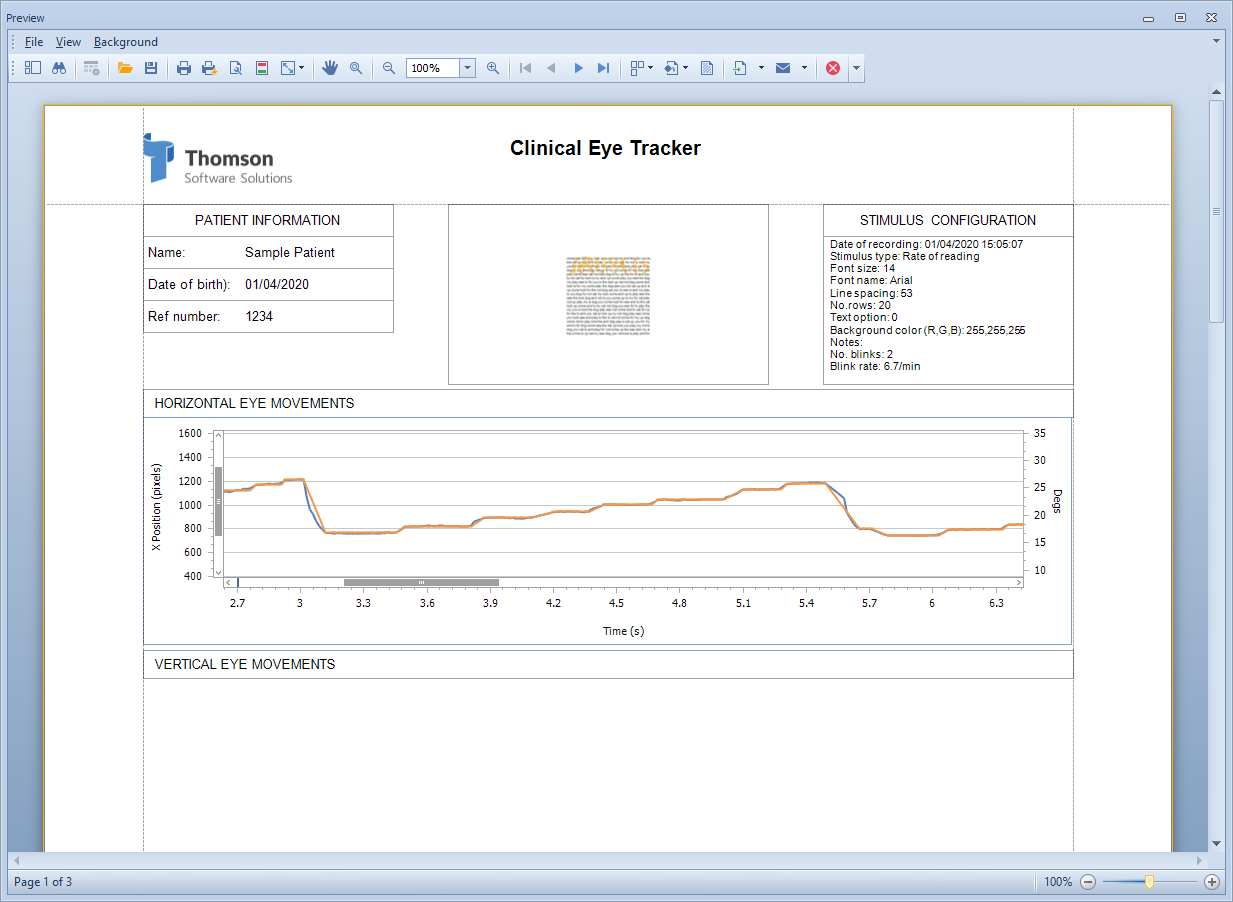A copy of the Horizontal eye position, Vertical eye position and Convergence data can be printed by selecting  Full report or XY only from the Print panel menu at the top of the screen. then selecting Print.