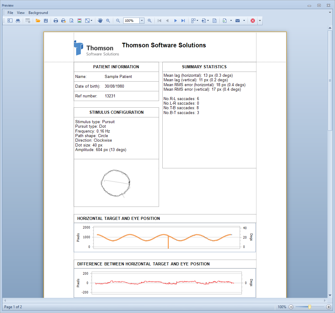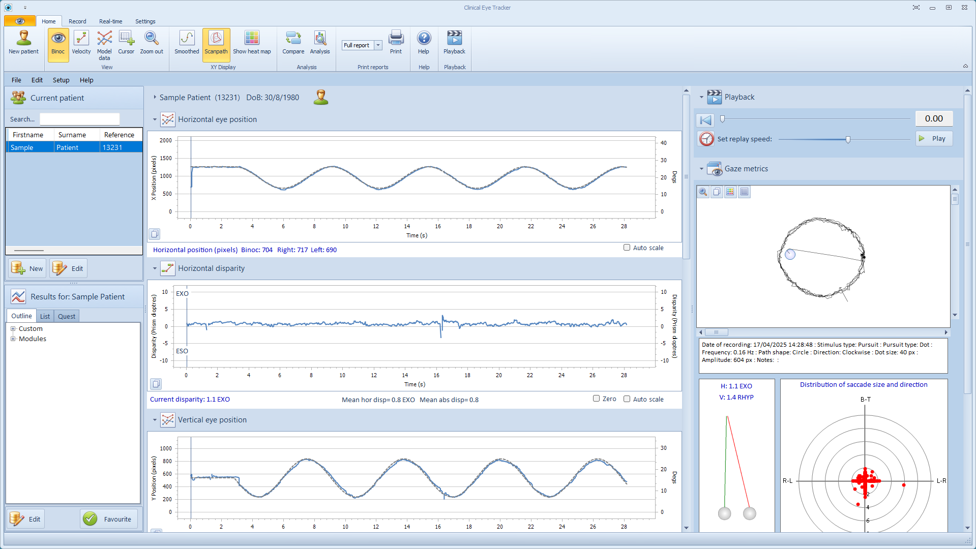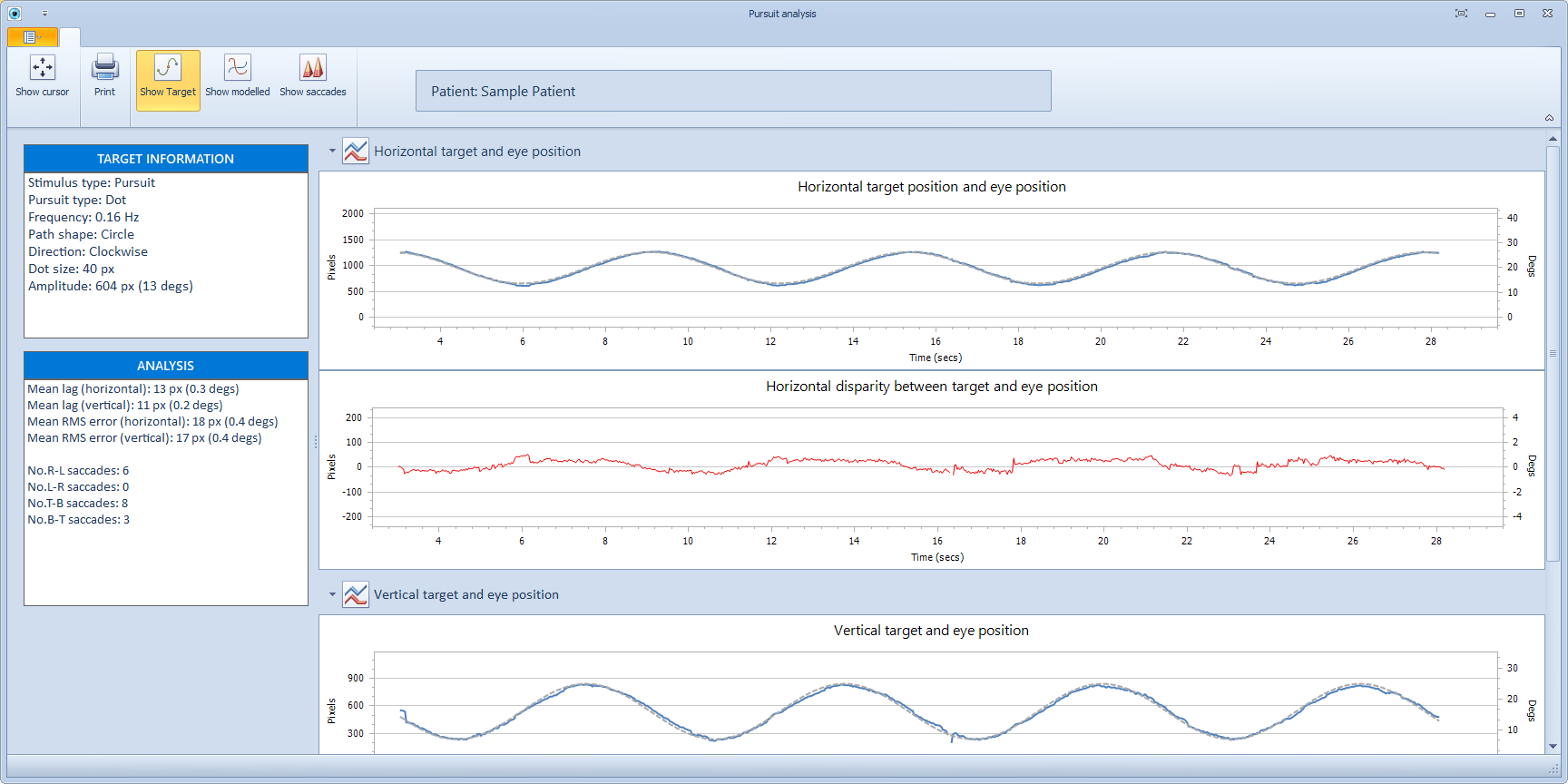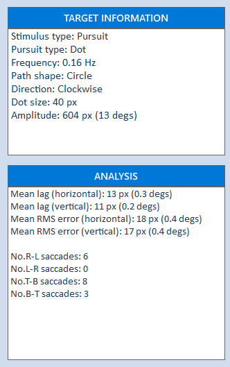The Clinical Eye Tracker 5L includes a Pursuit Analysis module which automatically analyses the pattern of eye movements made during the Pursuit test.
