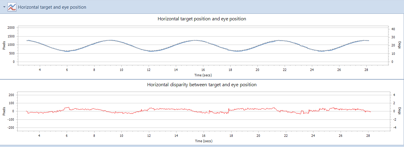 The second panel shows the difference in the horizontal location of the target and the eyes. If the horizontal gaze position corresponds with the target position, the disparity will be zero.