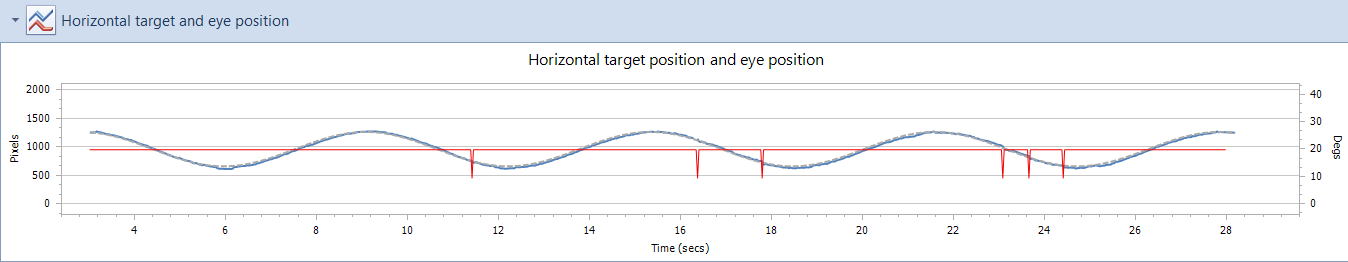 To further analyse the recording, the software models the data, identifying saccades and smooth pursuit components. The modelled data can be shown by selecting Show modelled.