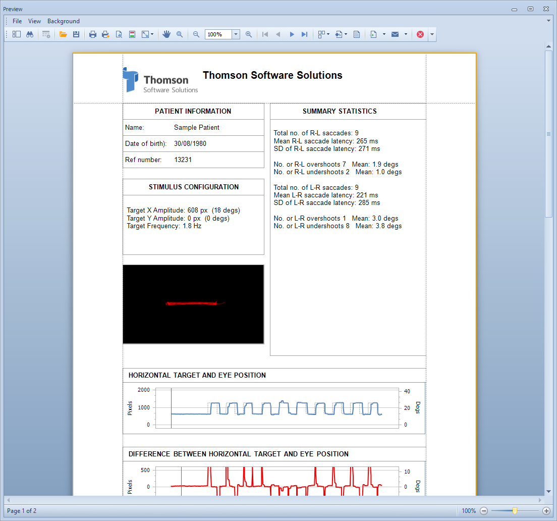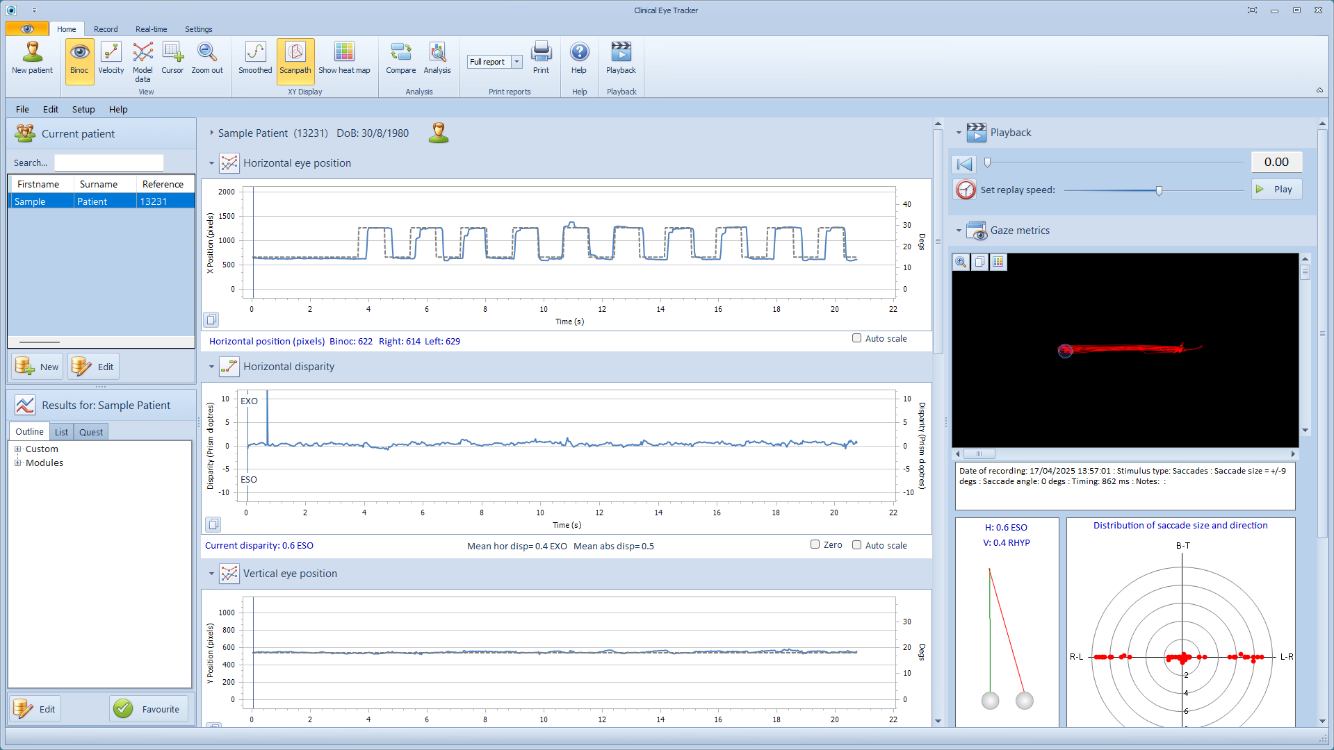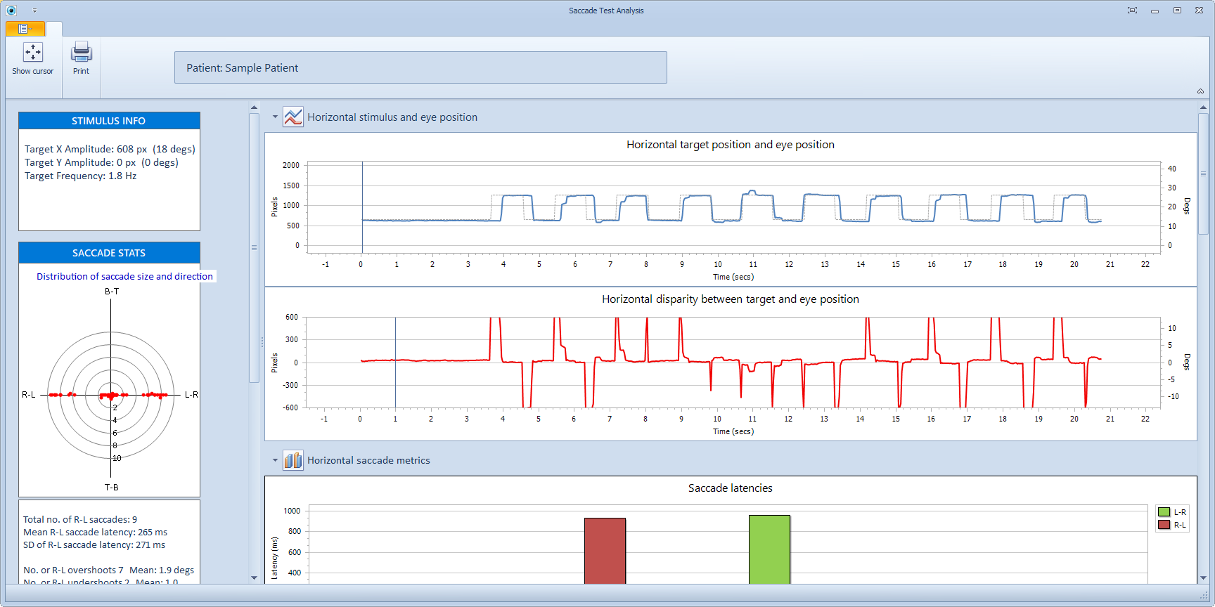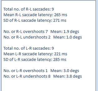 The Clinical Eye Tracker 5L includes a Saccade Analysis module which automatically analyses the pattern of eye movements made during the Saccade test.
