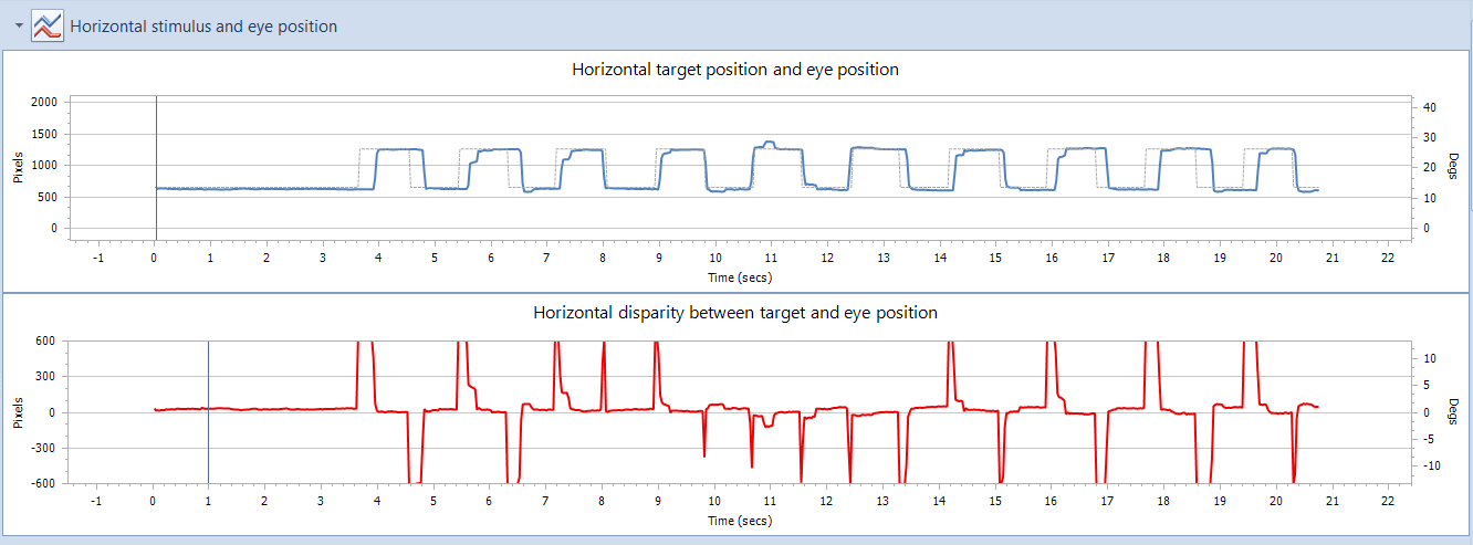 The second panel shows the difference in the horizontal location of the target and the eyes. If the horizontal gaze position corresponds with the target position, the disparity will be zero. The graph below show a disparity representing the reaction time between the target moving and a saccade being initiated.