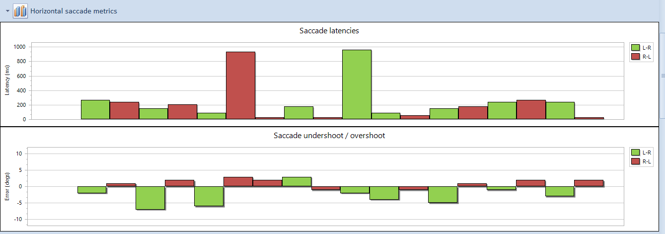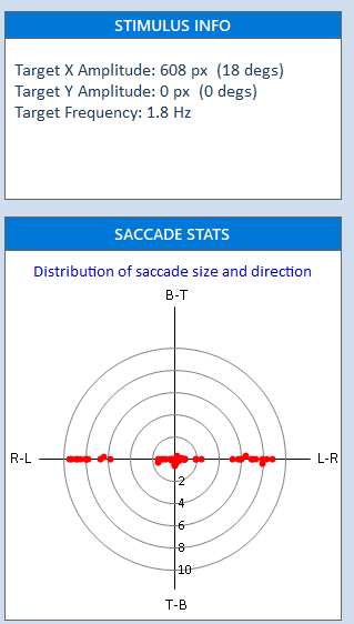 For example, the chart above shows a typical distribution of saccades while performing the saccade test, with a cluster of large left-to-right and right-to-left saccades representing the saccades made as the patient follows the target. The cluster of smaller saccades represents the saccades made to correct under and overshoots.