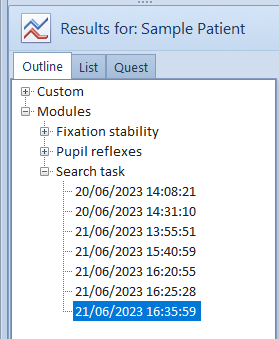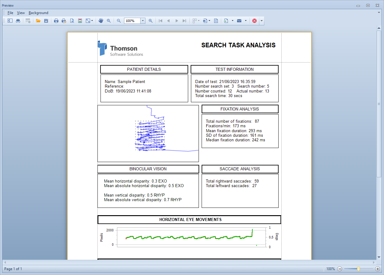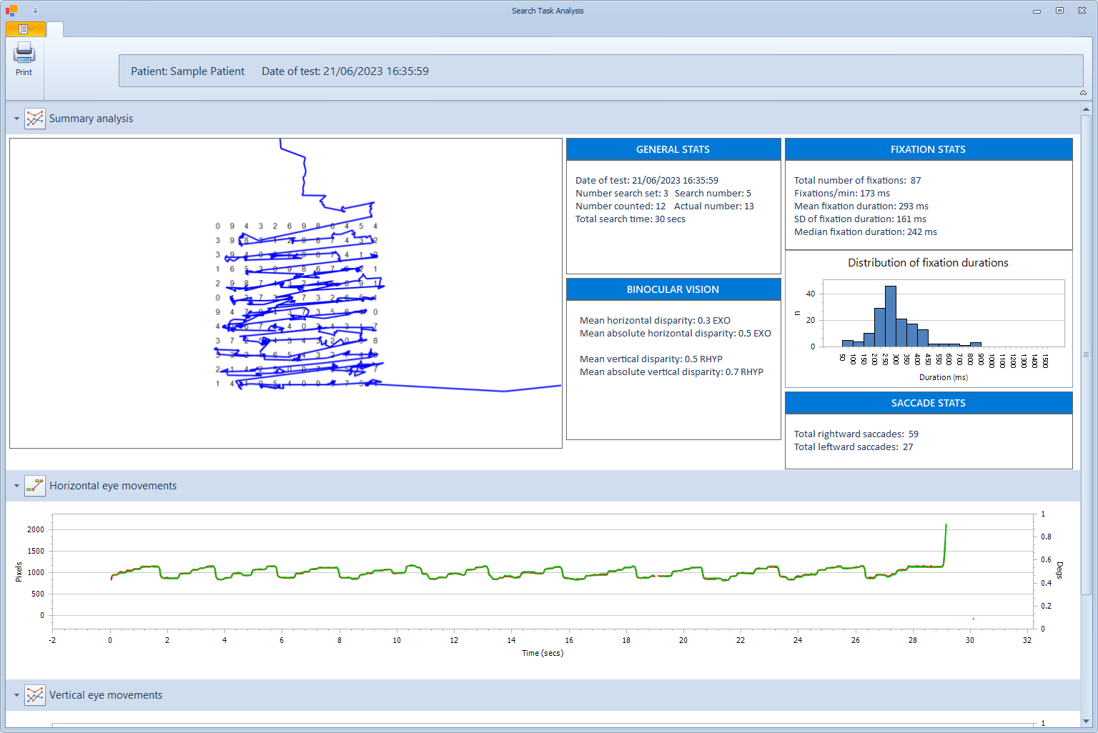 A bespoke report summarising the eye movements and visual performance while performing the Search task, can be created by selecting Print from the toolbar.