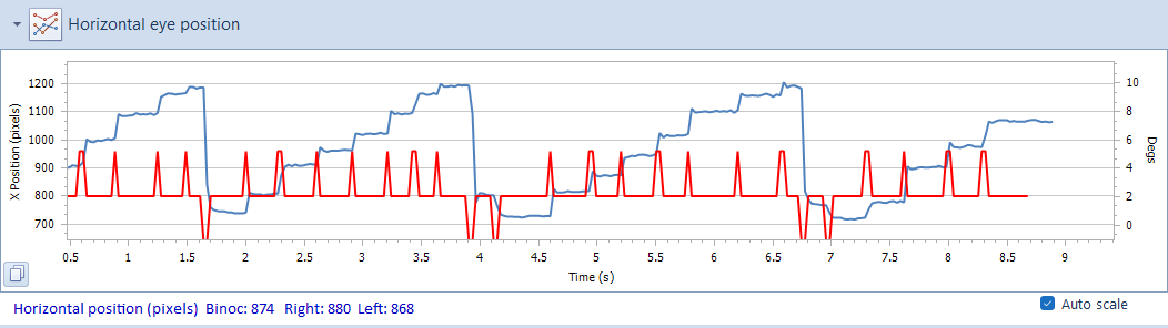 A trace showing the first differential (velocity) of the X position (horizontal) and Y position (vertical) traces can be added to the display by selecting Velocity in the toolbar. The velocity trace is displayed in Red as shown below.
