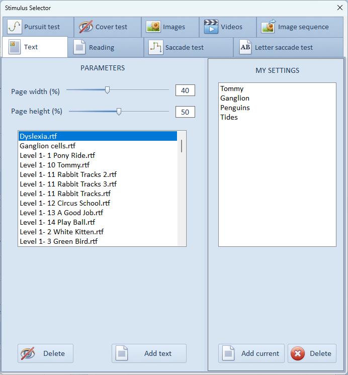 The available stimuli are categorised into 9 groups (Text, Reading, Saccade test, Letter saccade test, Pursuit test, Cover test, Images, Videos and Image sequence). Each category is selected using the corresponding tab.