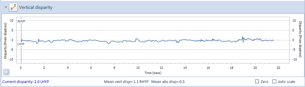 Incorrect calibration can sometime result in the recordings for the two eyes showing a constant disparity when none actually exists. Checking the Zero check box will calculate the average disparity throughout the entire recording and subtract this from each data point, reducing the average offset to zero. This feature should be used with caution and only when the clinician is confident that the offset is an artifact