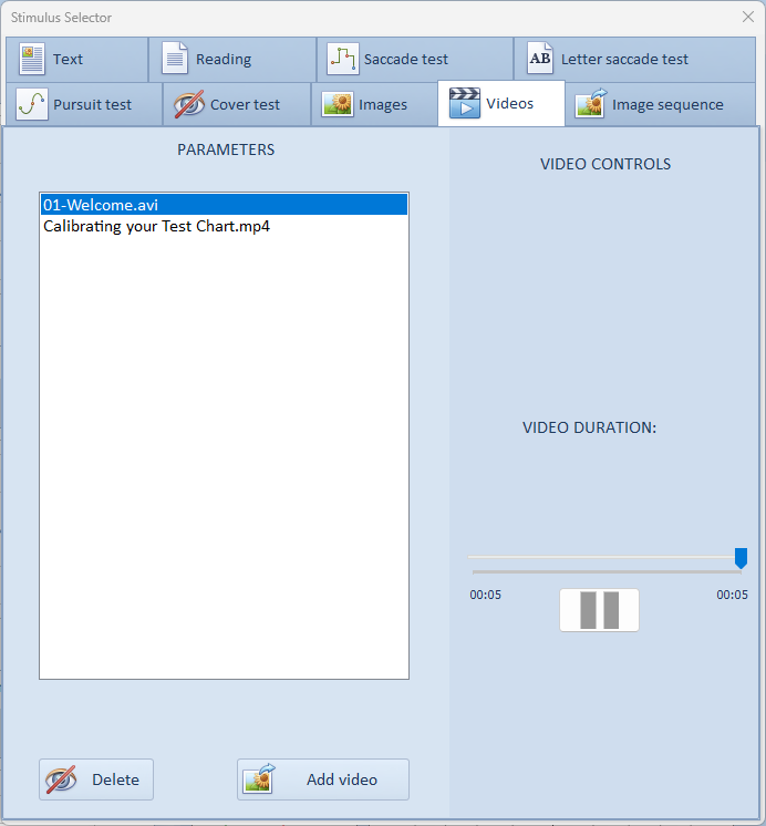 The Videos category allows virtually any video to be displayed on the screen. The program reads the video file from the Stimuli\Videos sub-directory of the ...\Eye Tracker Data\ directory. To add a new video, select Add video and select the video file that you wish to add to the list.