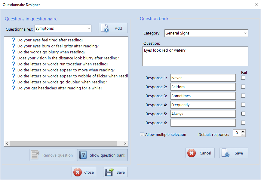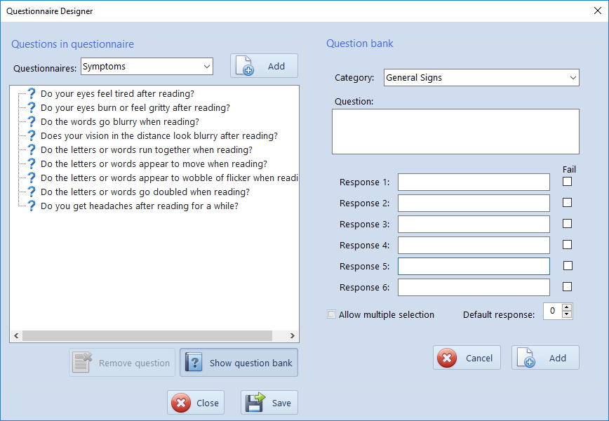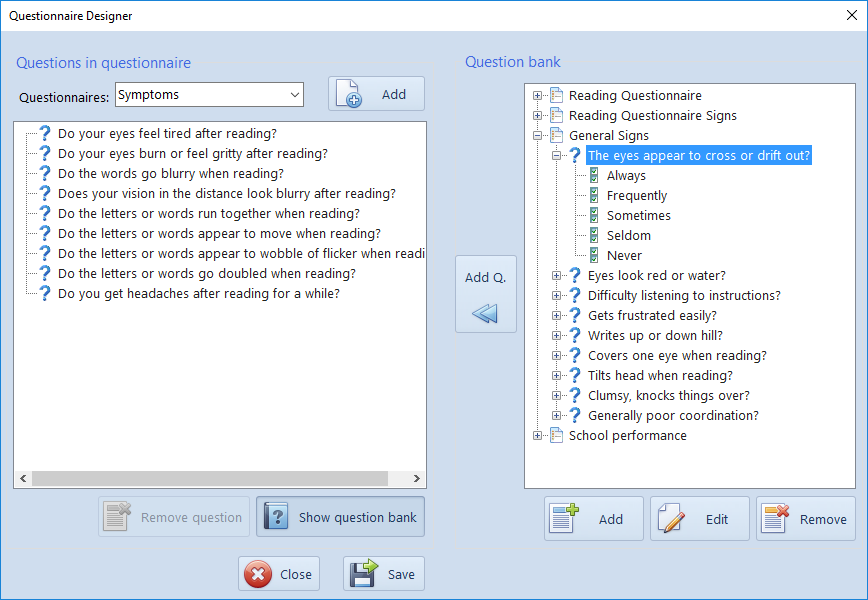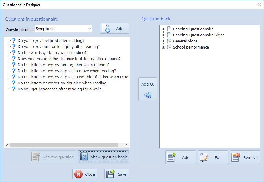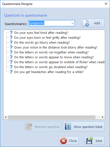 The software include a range of standard questions relating to reading, symptoms and signs in the Question bank. To display the Question bank click on Show question bank. This will display the screen shown below.