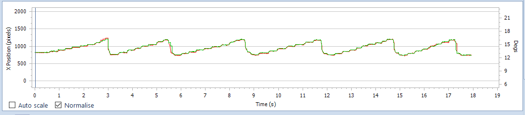 To view data for the right and left eyes individually, click on the button labeled Binoc in the toolbar - it will then change to Monoc. This will display the data for right (Red) and left (green) eye individually as shown below.