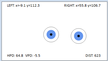 The Position metrics panel shows the horizontal and vertical position of the eyes throughout the recording. The location of the centre of the pupils is shown in mm at the top of the graphic. This is measure relative to an axis from the centre of the screen and normal to the plane of the screen.