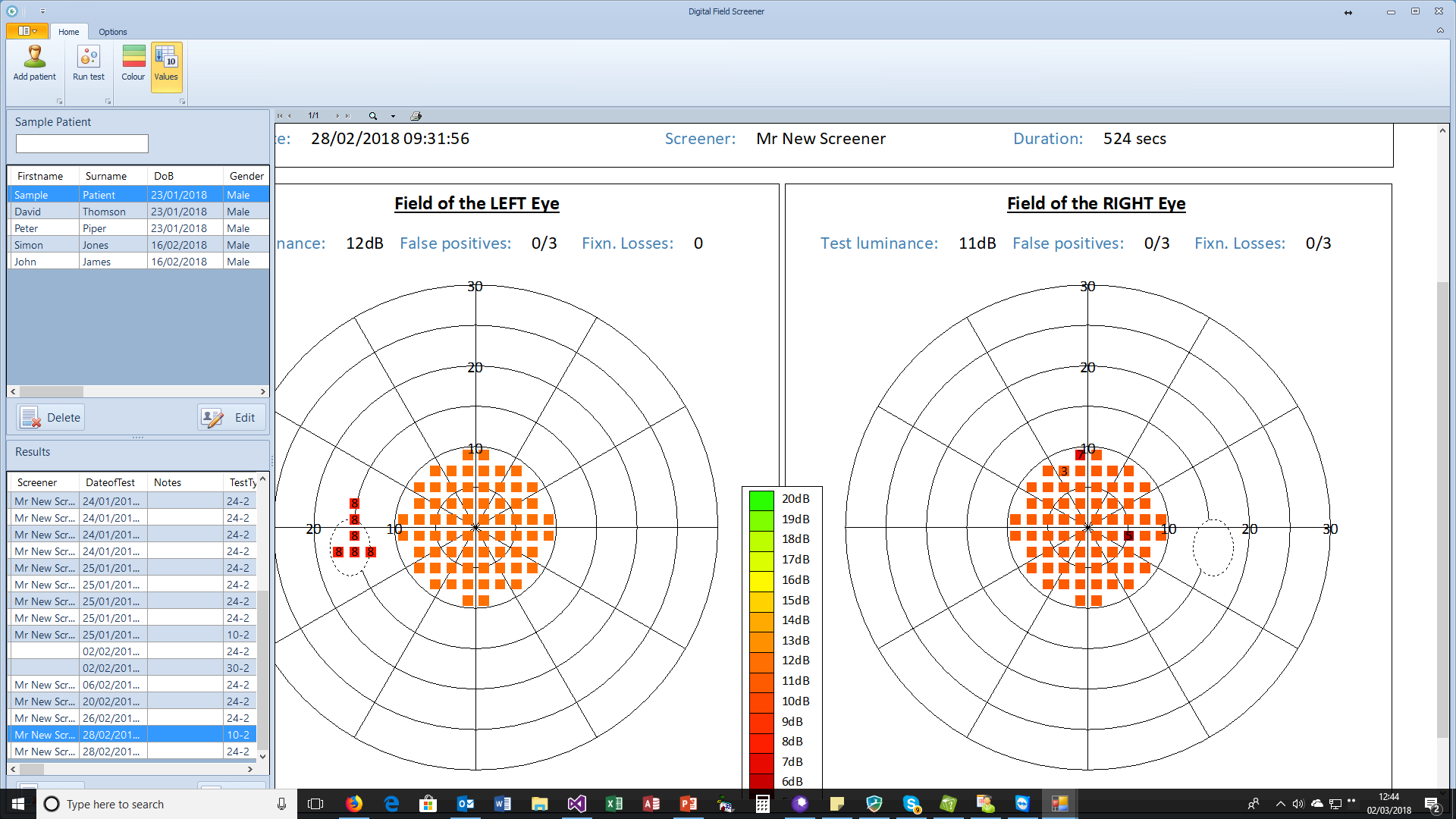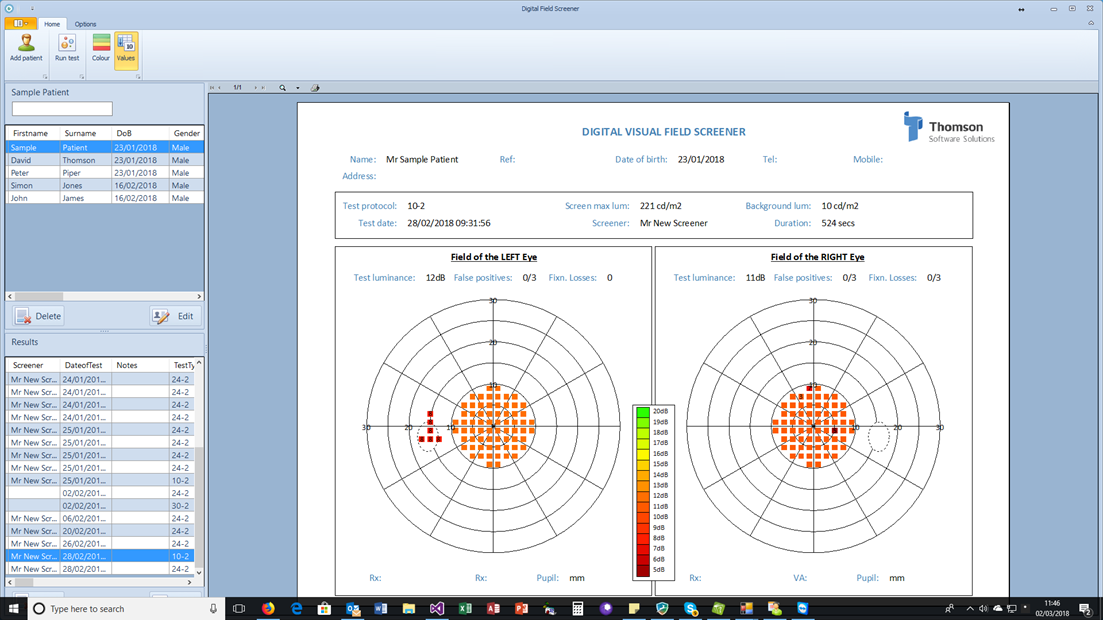 To display the results of a visual field examination, select the patients name from the top list and the results from the lower list. The chart will be displayed automatically (see example below).
