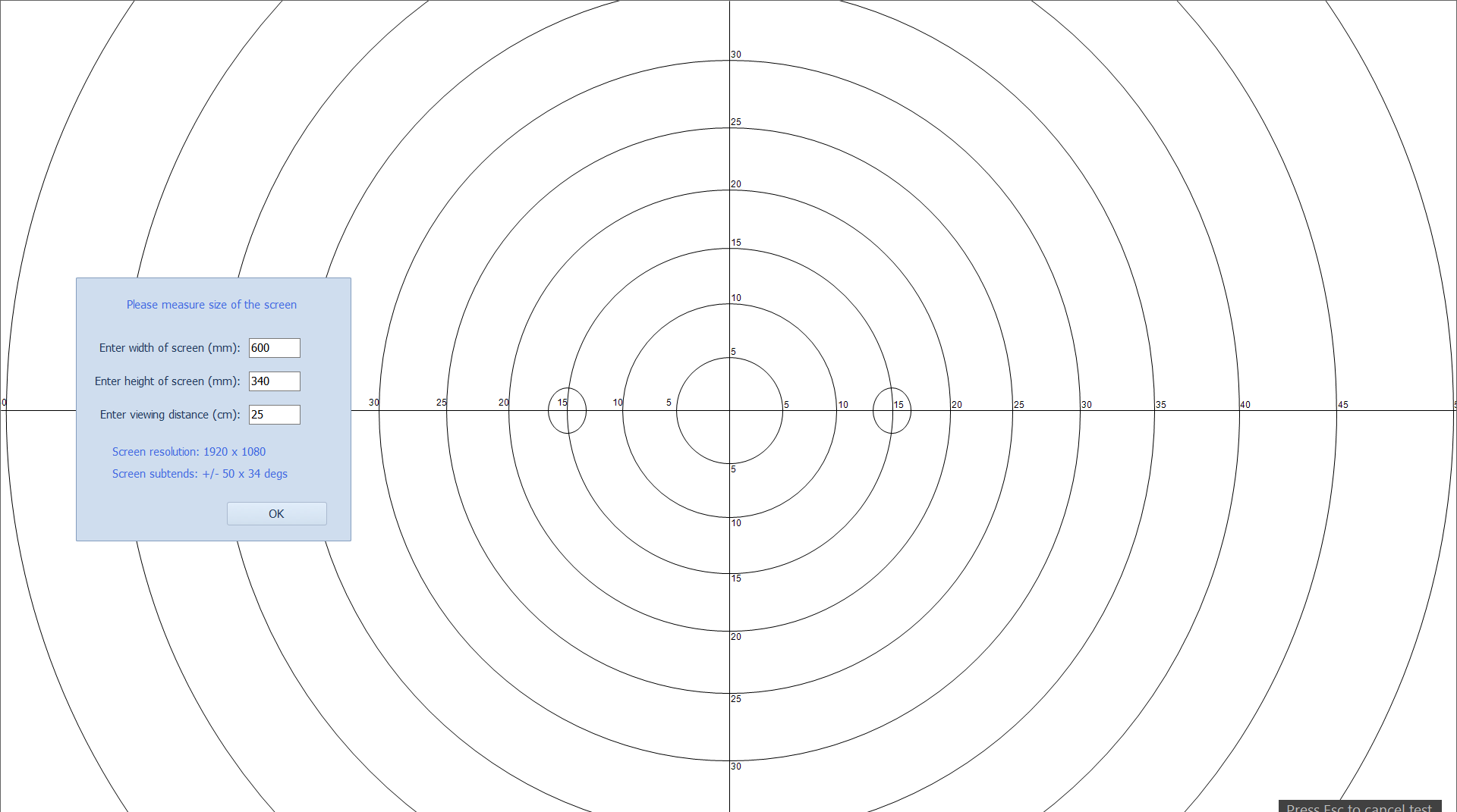 If the angle subtended by the screen is less than that required by the test protocol (30-2 requires +/- 33 degs, 24-2 requires +/- 26 degs and 10-2 requires +/- 12 degs), the fixation target will be moved throughout the test so that the more eccentric stimuli can be tested.