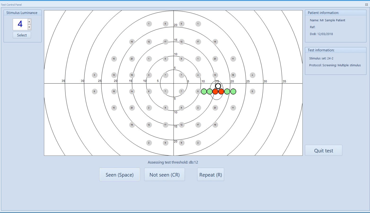 In single screen mode the patient is simply instructed to fixate as steadily as possible and press the space bar if they see a "dot flash". In dual screen mode, the process can be monitored as shown below.