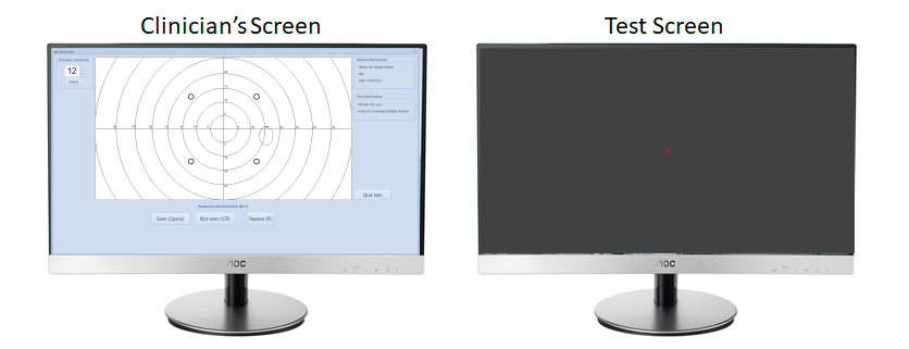 In dual screen mode (as shown below), the position of the stimuli are shown on the control screen. The examiner enters the patient's response (Seen or Not seen by clicking on the corresponding buttons). A stimulus can be re-presented by clicking on Repeat.