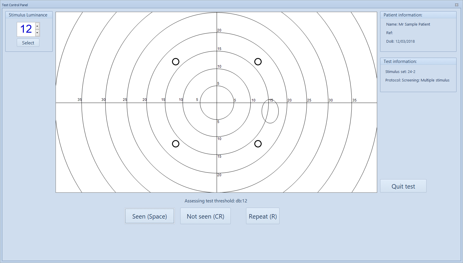 To determine the working threshold, groups of three or four stimuli are presented in the mid-periphery at varying luminances (dB) and the patient is simply required to report if they can see any or the stimuli. The test starts at 12dB, a luminance that most patients will be able to easily detect.