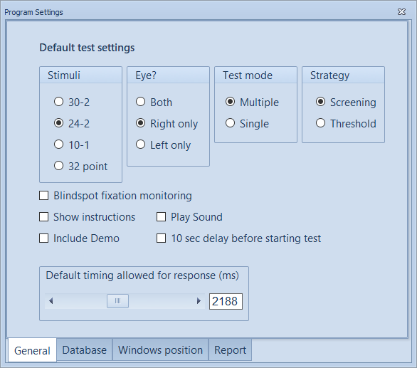 This determines the default mode for Blindspot fixation monitoring. If this option is selected, the software will present a series of stimuli to determine the position and size of the blindspot. A stimulus is then periodically presented in the centre of the blindspot. If the patient is fixating accurately, this stimulus will not be detected. If however, the patient is not fixating correctly, the stimulus will fall outside the blindspot and will be detected. This therefore provides an indication of how well the patient is fixating and is reported as Fixation losses /3 on the chart.