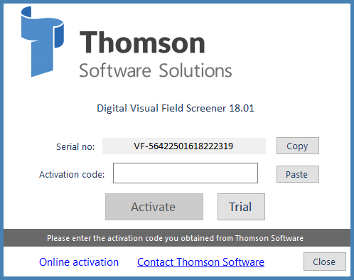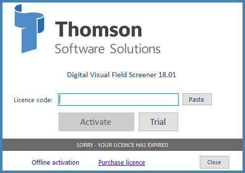 To activate the software, please contact Thomson Software Solution to obtain an Off-Line activation code quoting the serial number shown. This code will be sent by email and can be pasted directly into the Activation code box. Click on Activate to register the licence. The software will then confirm the validity of the licence. If successful, the licence window will disappear and the program will load.