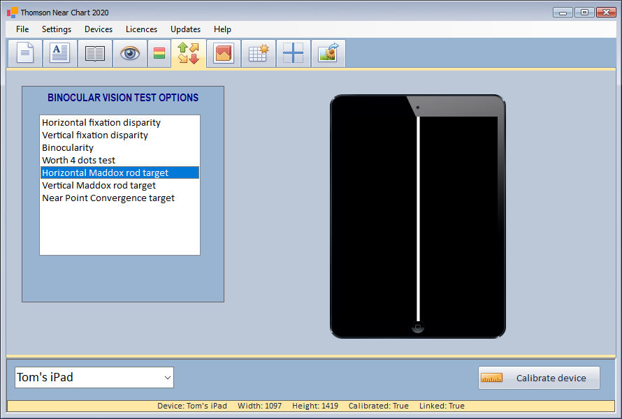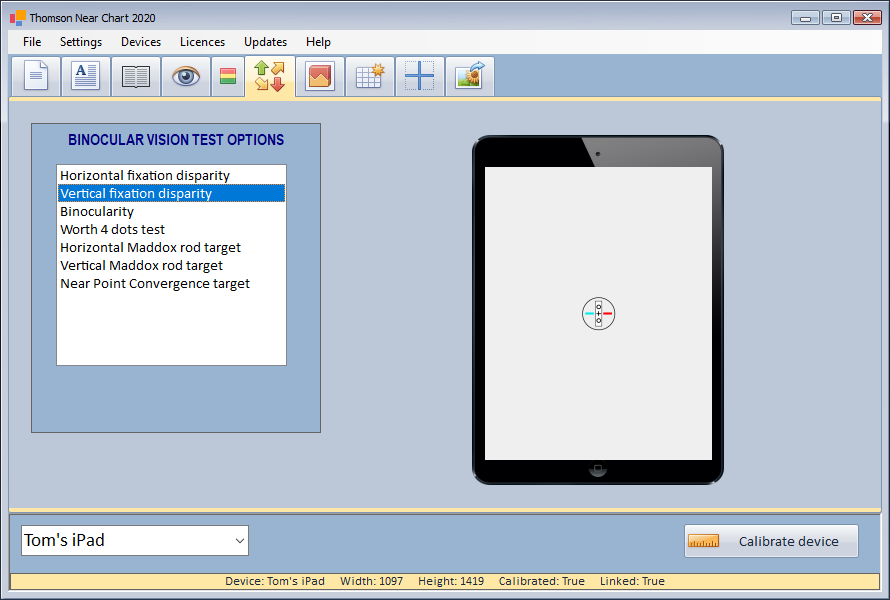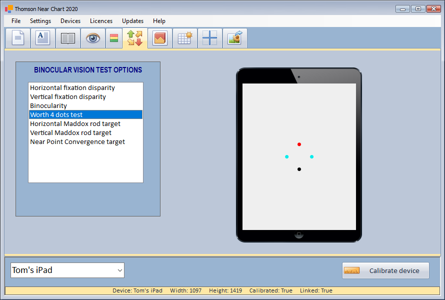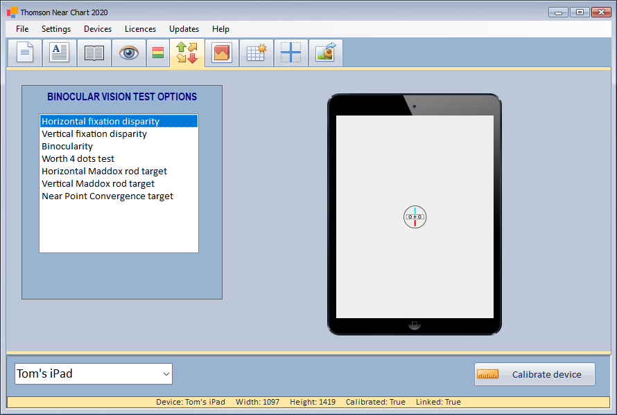 It is very important that the device colours are well-matched to the spectral properties of the red and green glasses used to ensure that the bars are seen monocularly and there are no binocular cues. The precise colour of the red and cyan bars can be adjusted by selecting Calibrate.