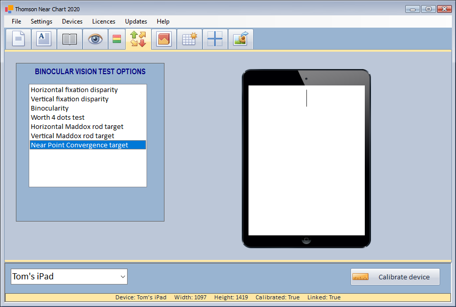 When assessing the Near Point of Convergence (NPC), a vertical line is slowly moved towards the patient's nose. The patient is asked to report if/when the line goes doubled while the clinician watches for the breakpoint. The line is placed toward the top of the screen to allow the clinician to peer over the device and get close to the visual axis.