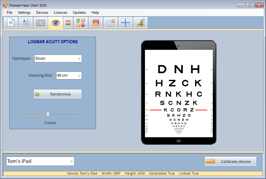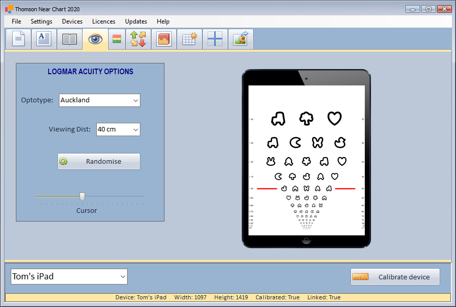 NOTE: The quality of the text displayed on the device will depend on the resolution/pixel density of the screen. The clinician must take this into account when assessing the patient's logMAR acuity.