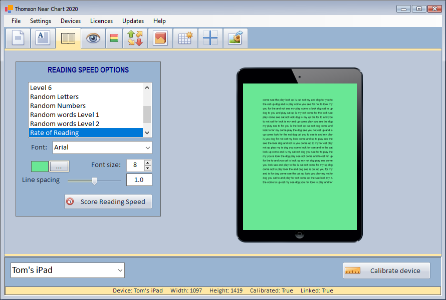 A range of texts are provided to allow the assessment of reading speed across a diverse range of patients. The size and font style of the text and the spacing of the rows can all be adjusted as required. This is particularly useful when assessing patients with Visual Stress where the spacing of the rows can be important.