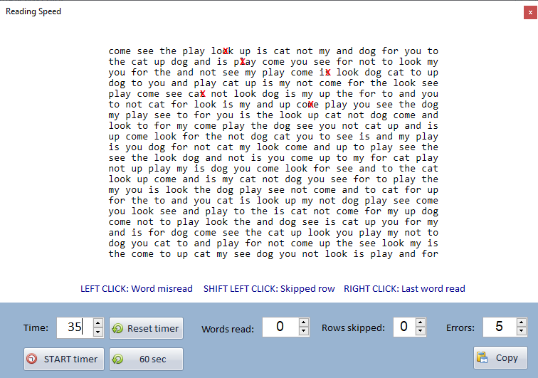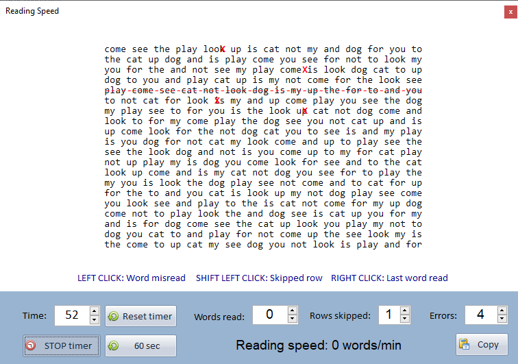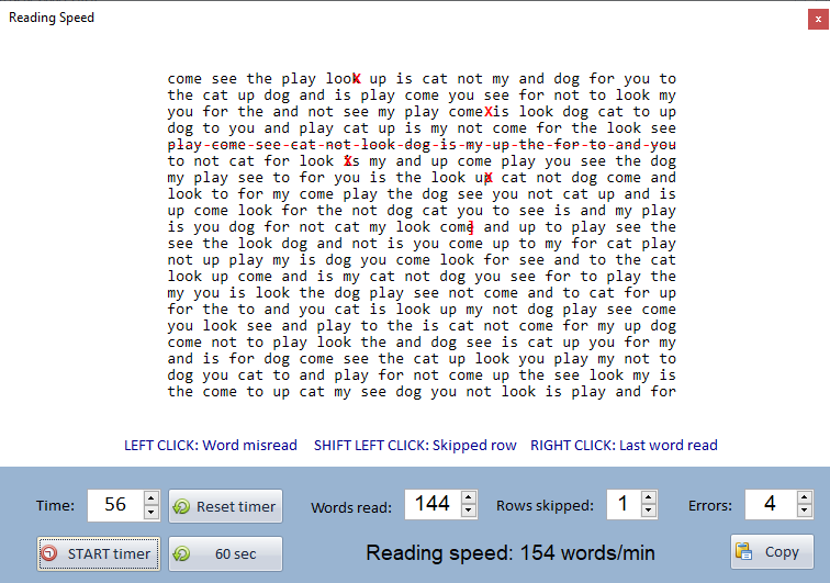 If a row is skipped, the number of words on that row will be automatically deducted from the Words read.