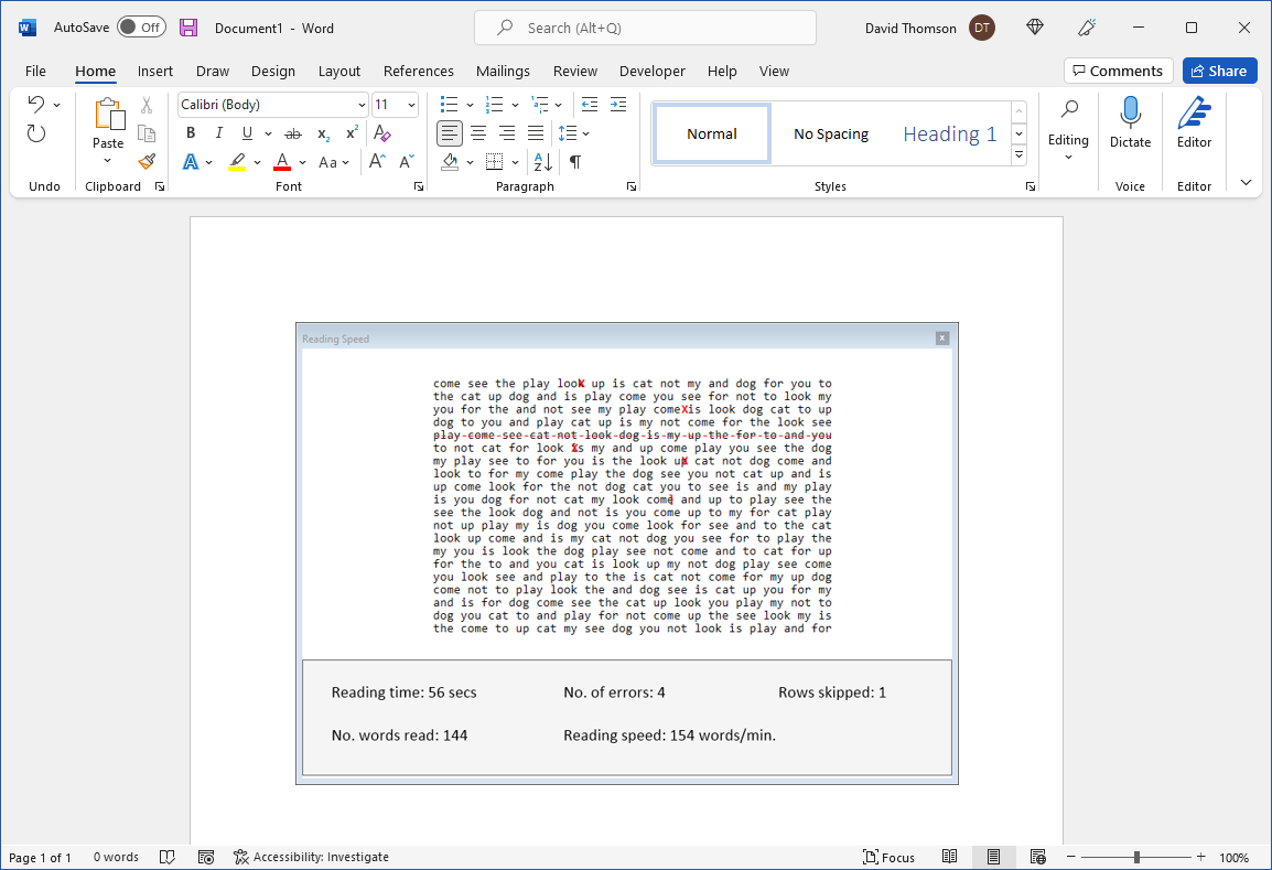 If the patient reads any word incorrectly, this can be recorded by simply clicking on the word in the transcript. A red cross will be placed over the word (as shown below), and the Errors will be incremented.