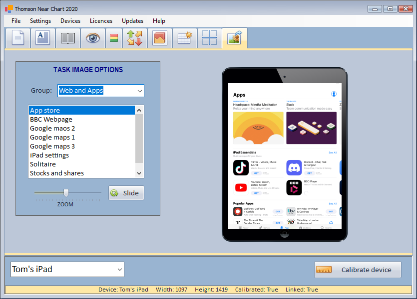 The Task images group includes a wide range of images which can be used to test the patients ability to see a range of "real world" images.