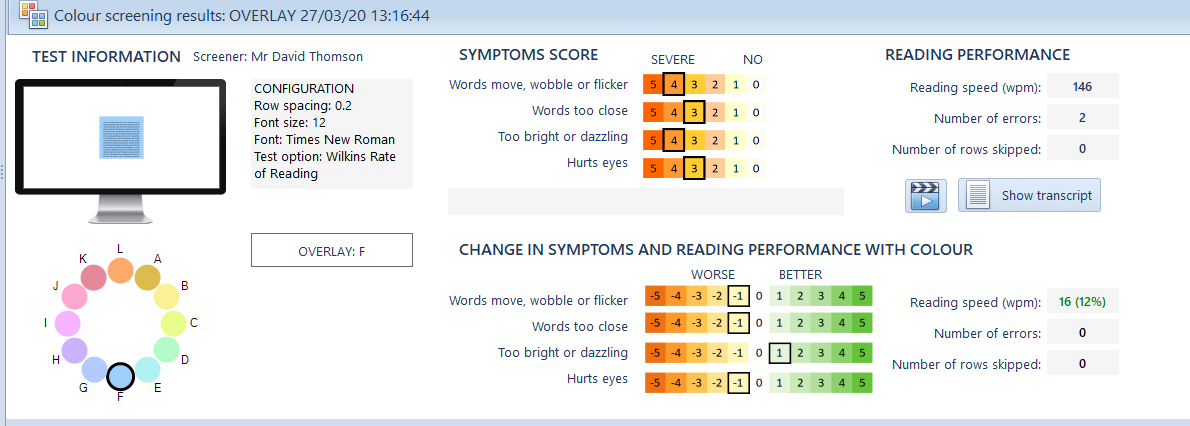 The second panel shows the outcome of the Colour screening results - i.e. optimum colour and the Reading Speed and symptoms with this colour.