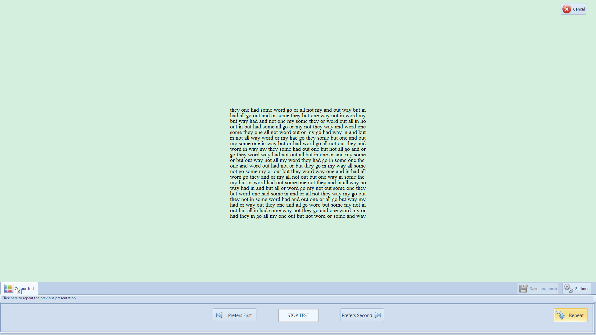 When in Lenses or Computer testing mode, a single paragraph of text will be displayed on the screen and the entire screen will be coloured - thus simulating the real world situation with lenses and a computer screen. The only difference is that the Lenses test is performed in a dark room (so that the entire visual field is coloured) while the Computer test is performed with the room lights on.