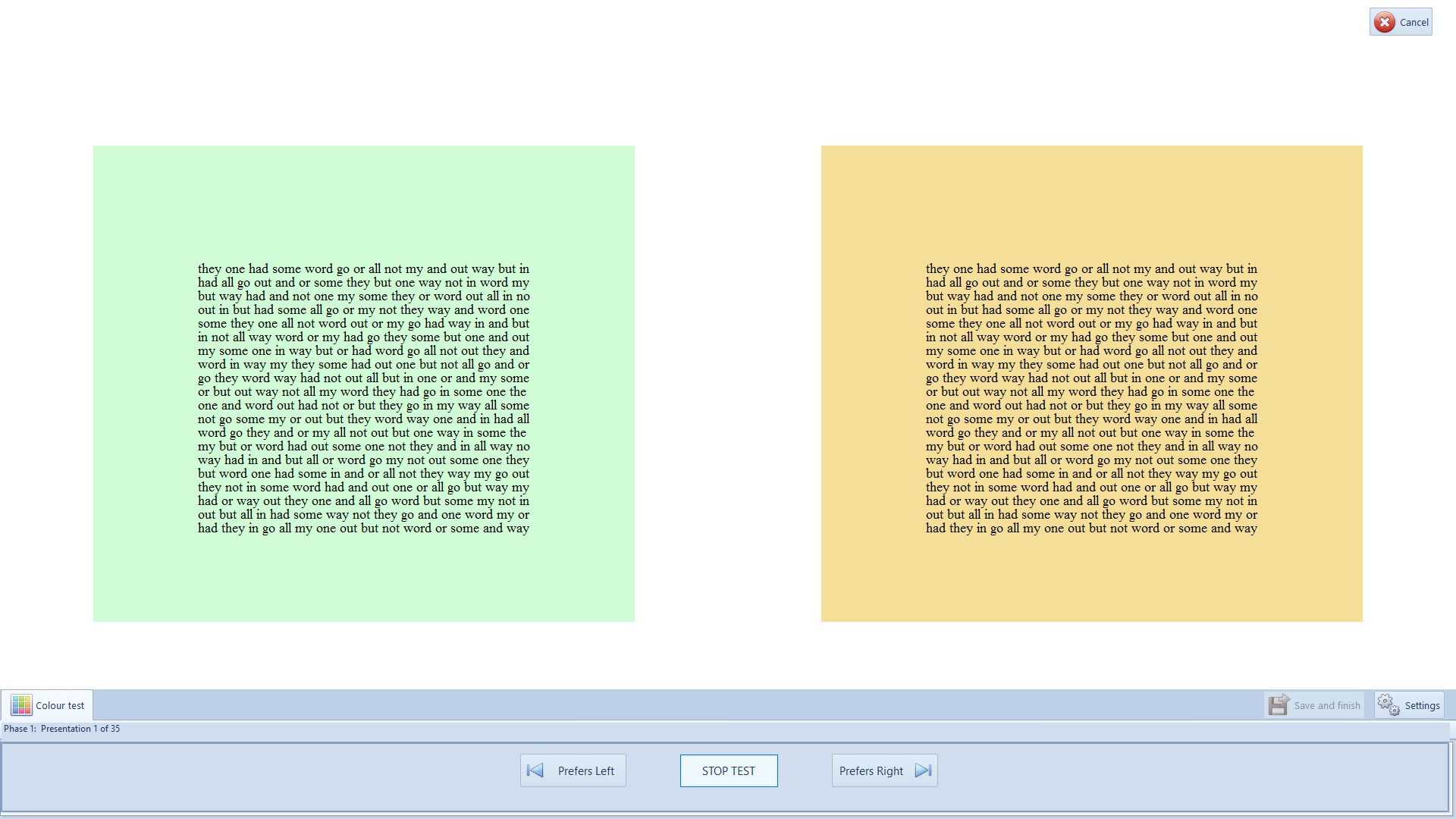 The colour of the screen will then be changed automatically to show two ReadEZ colours, one after the other - the patient has to simply indicate which of the two colours are more comfortable (alleviate their symptoms more). The patient responds by saying "first" or "second" and the clinician records their response.