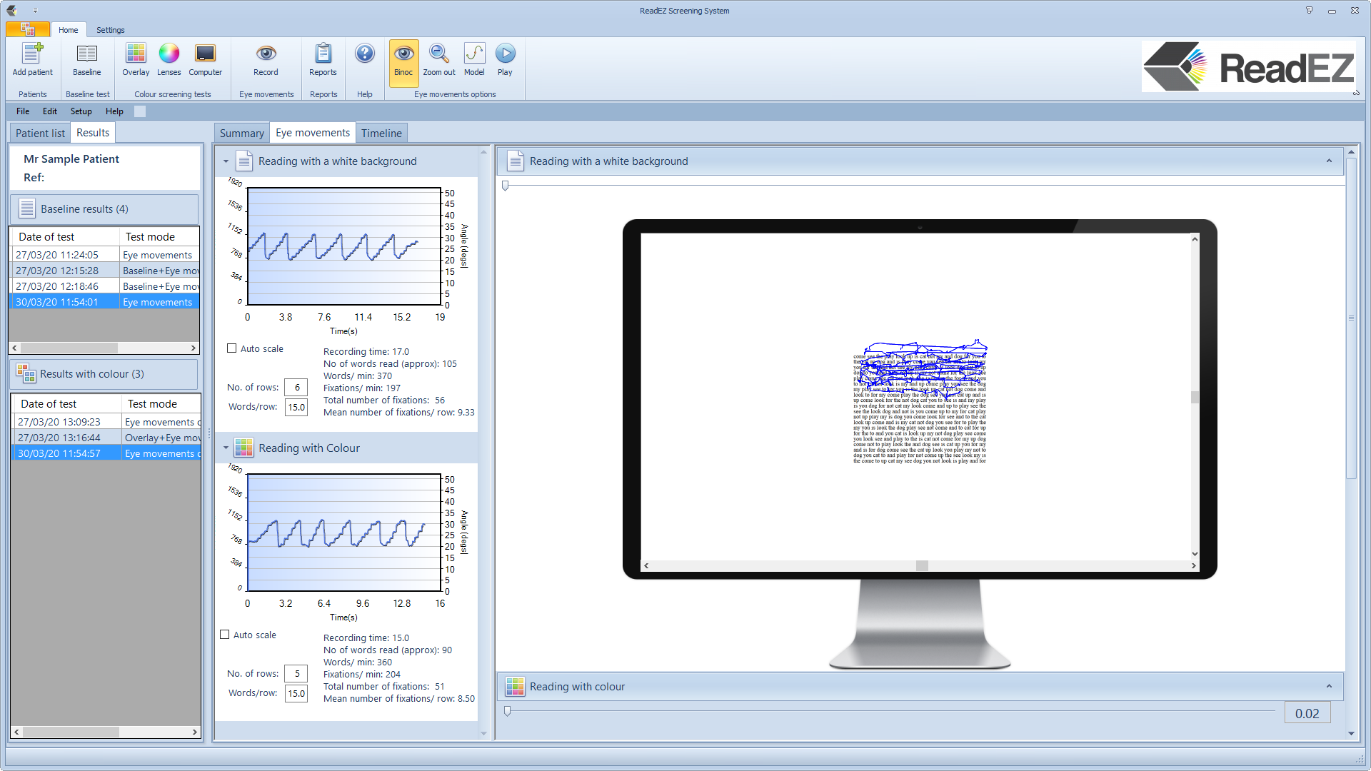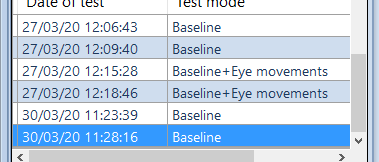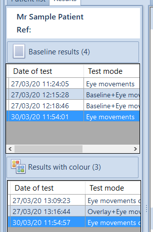 If an eye movement recording has been made as part of a Baseline or Colour test, this will be indicated in the results list with an affix of "+ Eye movements" as shown below.