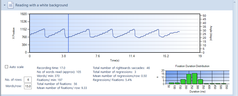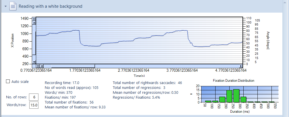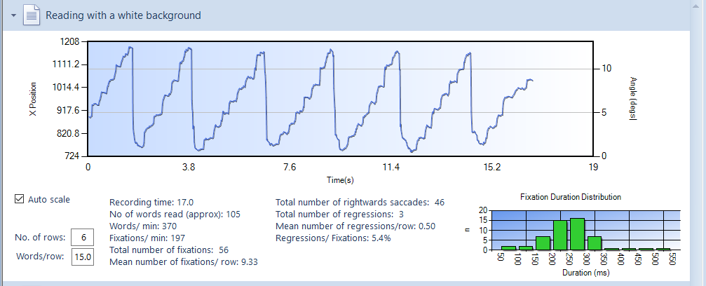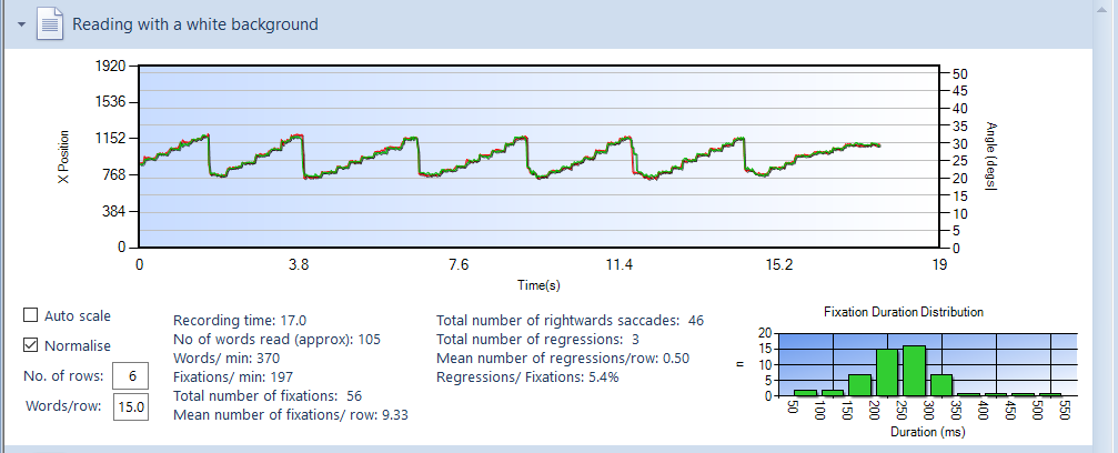 The algorithm calculates the total number of small leftward saccades. These are known as regressions and normally represent occasions where the patient has gone back to re-read a word. Those having difficulty reading generally make more regressions.