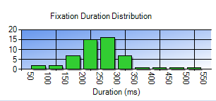 This shows a frequency distribution of the duration of the fixations throughout the recording. In general, good readers have a lower median fixation duration and few long duration fixations.