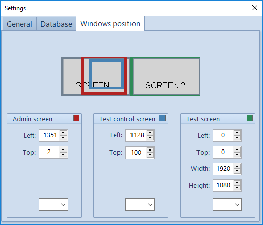 This can be done automatically by clicking on the screen number (1 or 2) in the combo box for each screen or by manually setting the Left and Top, settings.