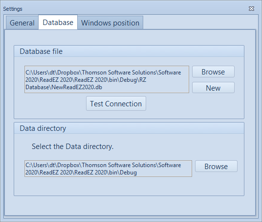 The database panel specifies the location of the SQLite database file. This will normally be set up during the installation process and does not need to be changed unless you wish to change the database location (to a shared drive for example).