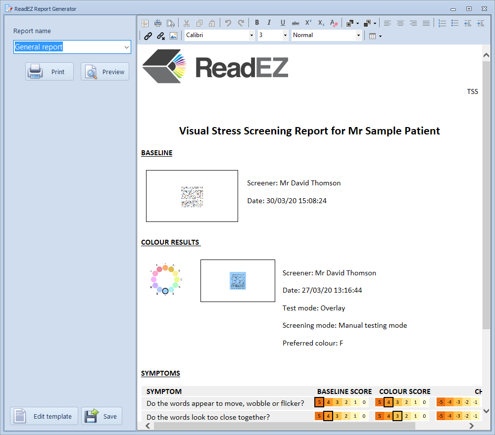 The report may be edited directly, adding additional notes as required and using a full set of formatting options in the toolbar. The edited report can then be printed (Print) or saved (Save). The report will be saved in HTML format which can then be read by most word processors.