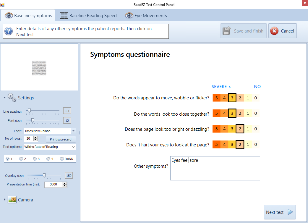 The patient should be instructed to look at the passage of text (which will be displayed against a white background for the Baseline test and against a coloured background after the colour screening). The exact configuration of the text (line spacing, font size, font, number of rows and text) can be changed from the Settings panel. The optimum configuration will depend to some extent on the monitor size and the patient. In general, settings should be chosen to maximise any Visual Stress symptoms.