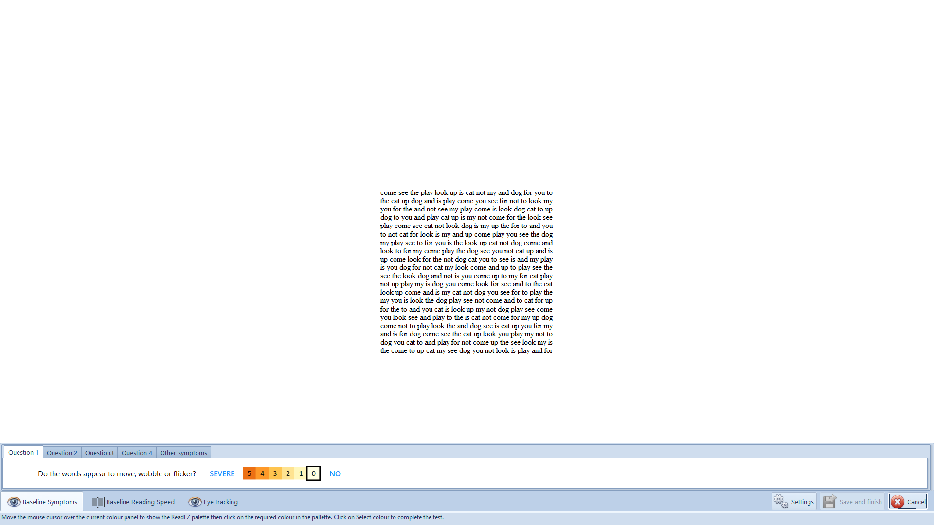 The patient should be instructed to look at the passage of text (which will be displayed against a white background for the Baseline test and against a coloured background after the colour screening). The exact configuration of the text (line spacing, font size, font, number of rows and text) can be changed from the Settings panel. The optimum configuration will depend to some extent on the monitor size and the patient. In general, settings should be chosen to maximise any Visual Stress symptoms.